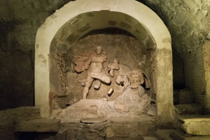Al di sotto della chiesa c’è un mitreo situato ad est della cripta, oltre le fondamenta dell'abside. E' orientato verso est, cioè verso il punto dove sorge il sole, dove è situato l'altare. Tra tutti i mitrei conosciuti, questo di S.Prisca è il più completo, in quanto, a parte la sua quasi totale conservazione e gli affreschi, possiede delle adiacenze così importanti che ci mostrano un vero e proprio "Santuario Mitraico".