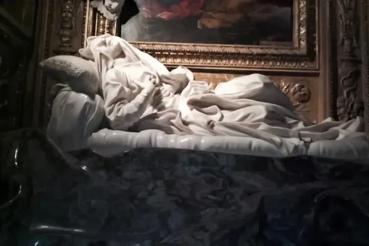 Gian Lorenzo Bernini la raffigura coricata in estasi e da sempre la scultura è meta di pellegrinaggi di turisti e fedeli. E le sue spoglie riposano lì, in quell’incredibile opera d’arte che illumina la chiesa Trasteverina.
