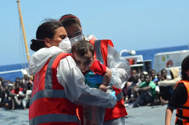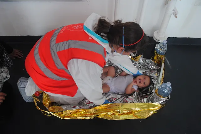 Siamo medici ed infermieri, viaggiamo sempre in due, saliamo sulle motovedette andando al largo fino a 120 miglia, vediamo anche le coste libiche da lontano, con mare anche forza 7, impossibile da spiegare. Però ce la facciamo sempre. Vediamo nel monitor della motovedetta i gommoni che arrivano, uno accanto all’altro. Da lontano si vedono delle cose poco definite, poi vediamo che è un gommone con 120, 140 persone. Quando arrivano vicino alla nostra nave per prima cosa cerchiamo di tranquillizzarle. Perché quando sentite ai notiziari che ci sono dei morti bisogna ricordare che muoiono davanti ai nostri occhi perché appena ci vedono, vedono la salvezza e cominciano a buttarsi in acqua. Noi con la Guardia Costiera cerchiamo di farli scendere con calma con le motovedette. Allora si comincia prendendo i bambini e le donne incinte.