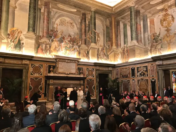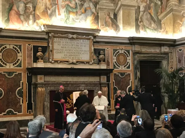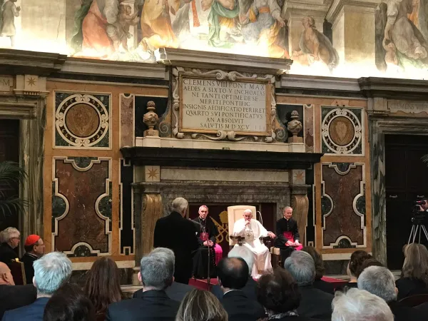 Nella Sala Clementina circa duecento persone che hanno partecipato al Simposio dedicato al diritto hanno ascoltato il Papa.