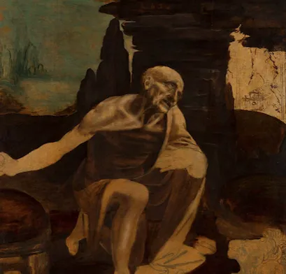 L’occasione della mostra sono le celebrazioni per i cinquecento anni dalla morte di Leonardo da Vinci (1452-1519). Il soggetto è intenso, il padre del deserto Girolamo. C’è chi ha voluto vedere nel quadro il frutto di una devozione privata dell’artista. Ma la storia è confusa. Il dipinto è documentato agli inizi dell’Ottocento nella collezione della celebre pittrice Angelica Kauffman.