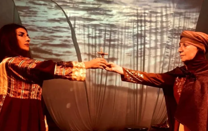 “Due donne che raccontano l’incontro di due uomini è la forma originale di questo spettacolo ‘Francesco e il Sultano’. Non si tratta di una bizzarra scelta estetica ma dell’incontro con due persone straordinarie come la cantante siriana Mirna Kassis e l’attrice italiana di fede musulmana Valeria Khadija Collina.