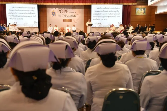 Il Papa - alle ore 11.15 di Bangkok e ore 05.15 di Roma - viene accolto all'ingresso dell'edificio Ruamchitpientham dal Cardinale Arcivescovo di Bangkok, dal Direttore dell'Ospedale e dalla religiosa responsabile del personale infiermieristico. "Saluto con affetto le Suore di San Paolo di Chartres, come pure le altre religiose qui presenti, e vi ringrazio per la silenziosa e gioiosa dedizione a questo apostolato", continua ancora il Papa nel suo saluto.