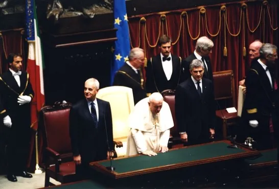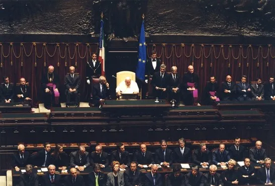 Due anni dopo nel citato discorso al Parlamento italiano Giovanni Paolo II approfondisce il tema rivolgendosi all’Italia : “ Le sfide che stanno davanti ad uno Stato democratico esigono da tutti gli uomini e le donne di buona volontà, indipendentemente dall'opzione politica di ciascuno, una cooperazione solidale e generosa all'edificazione del bene comune della Nazione. Tale cooperazione, peraltro, non può prescindere dal riferimento ai fondamentali valori etici iscritti nella natura stessa dell'essere umano. Al riguardo, nella Lettera enciclica Veritatis splendor mettevo in guardia dal "rischio dell'alleanza fra democrazia e relativismo etico, che toglie alla convivenza civile ogni sicuro punto di riferimento morale e la priva, più radicalmente, del riconoscimento della verità" (n. 101). Infatti, se non esiste nessuna verità ultima che guidi e orienti l'azione politica, annotavo in un'altra Lettera enciclica, la Centesimus annus, "le idee e le convinzioni possono essere facilmente strumentalizzate per fini di potere. Una democrazia senza valori si converte facilmente in un totalitarismo aperto oppure subdolo, come dimostra la storia" (n. 46)”.