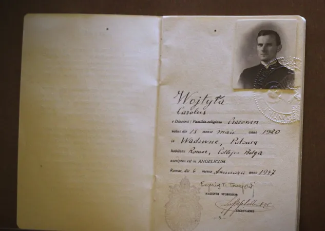 Wojtyła Carolus, ascriptus est in Angelicum”. E’ il 1947. La prima pagina del libretto universitario recante in alto a destra - ben evidente - la foto di quel giovane studente polacco che diverrà Papa Giovanni Paolo II, ci riporta indietro nel tempo. Veniamo catapultati in quegli anni romani che Wojtyła visse con intensità di studio presso la “Pontificia Università Angelicum” di Roma, retta dai Padri Domenicani. Ci sorprende lo sguardo di quella foto.