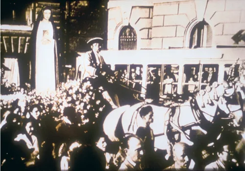 Poi la prima apparizione, mentre cerca i figli che giocano lì nel parco delle Tre Fontane. Li trova in una grotta davanti alla Bella Signora. Da quel momento l’uomo che voleva uccidere il Papa cambia radicalmente la sua vita, fino nel 1949 a consegnare a Pio XII il pugnale con il quale voleva ucciderlo.