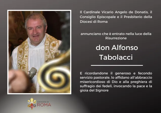 E' tornato alla Casa del Padre oggi pomeriggio don Alfonso Tabolacci. Attualmente parroco del Battistero Lateranense dal 2013. È stato vicario parrocchiale della parrocchia Santi Fabiano e Venanzio dal 2011 al 2013, della parrocchia Santa Maria Stella Maris dal 2007 al 2011 e della parrocchia San Tommaso D'Aquino dal 1998 al 2007.