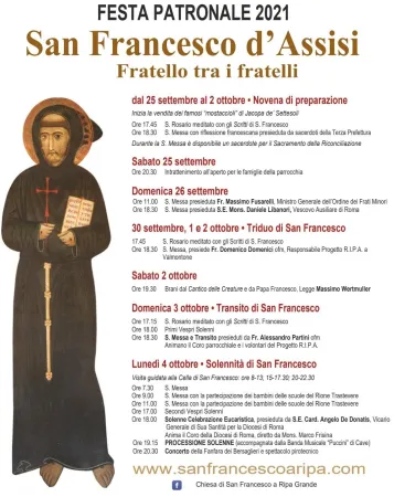 "Cari amici e fedeli si avvicina uno dei giorni più belli della nostra vita francescana, il 4 ottobre celebreremo San Francesco, solennità civile e giornata per la pace, per la fraternità e il dialogo fra le religioni". Così la Chiesa di San Francesco a Ripa Grande annuncia il programma per la festa di San Francesco il prossimo 4 ottobre.