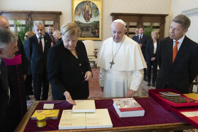Angela Merkel ha portato un libro con commenti ai Vangeli della domenica in tre volumi, un volume su Michelangelo e alcuni prodotti alimentari.