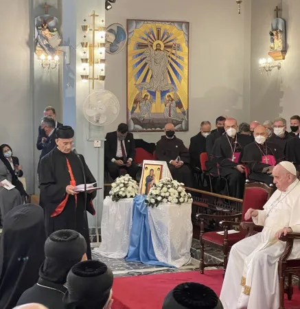 Il Papa viene accolto all'ingresso principale dal Patriarca maronita e dall’Arcivescovo, il quale gli porge la croce e l’acqua benedetta. Successivamente si recano insieme all’interno della Cattedrale. Dopo il canto iniziale, seguito dall’indirizzo di saluto del Patriarca di Antiochia dei Maroniti, e dall’alternarsi di canti e dalle testimonianze di una suora francescana e di una suora giuseppina e dalla Lettura degli Atti degli Apostoli, Papa Francesco pronuncia il suo discorso.