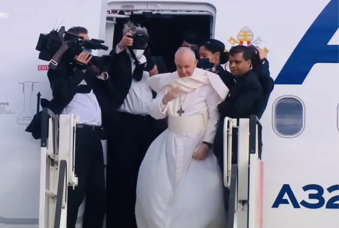 Il Papa sale per ultimo a bordo dell’aereo A320neo dell’Aegean per far rientro in Italia.