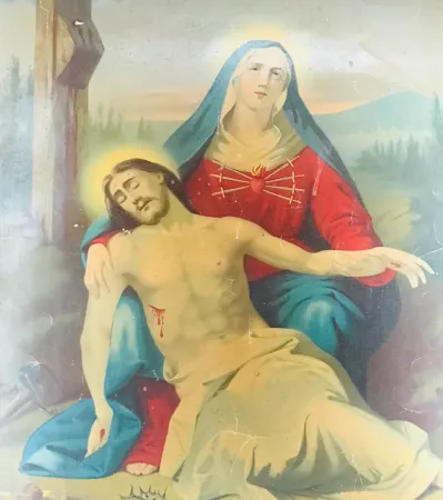 Un quadretto con una “pietà” la Madonna che tiene in bracci il corpo esamine di Gesù. Niente di artistico, solo lo sguardo di Maria verso il Cielo.