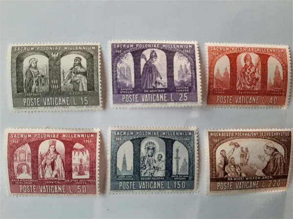 Nel 1966 fu celebrato il millennio del battesimo della Polonia. Per quell’importante anniversario i vescovi polacchi invitarono Paolo VI in Polonia e il Papa accolse l’invito con gioia. In Vaticano cominciarono i preparativi per il viaggio e si decise di preparare una serie commemorativa di francobolli. Purtroppo, il regime comunista impedì a Paolo VI di compiere il viaggio, spaventato dalle imprevedibili conseguenze della presenza del Pontefice in un Paese dietro la Cortina di Ferro.
