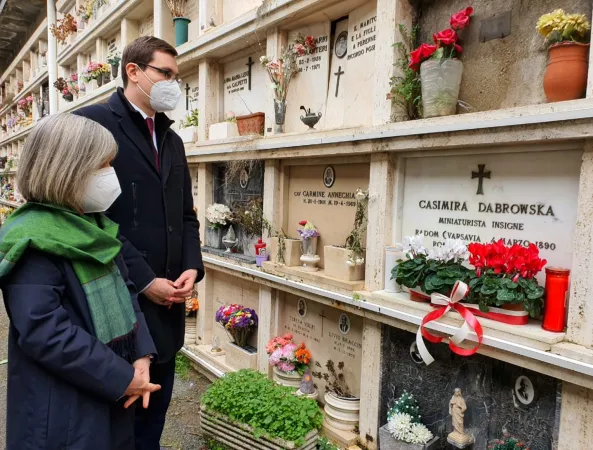 Kazimiera Dąbrowska morì il 4 febbraio 1972 a Roma, nel convento delle suore di S. Giuseppe di Cluny e fu sepolta nel cimitero romano di Prima Porta. Quest’anno, in occasione del 50° anniversario della morte Anna Kotanska, la consorte dell’Ambasciatore della Polonia presso la Santa Sede, e Marek Sorgowicki, il I Segretario dell’Ambasciata, hanno deposto i fiori sulla tomba dell’artista al cimitero sulla via Flaminia.