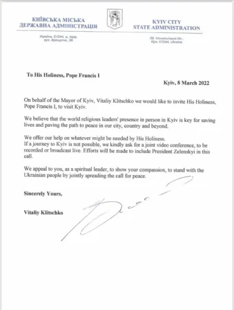 Nella lettera, datata 8 marzo, Klitschko scriveva: “Crediamo che la presenza di persona dei leader religiosi mondiali a Kiev sia la chiave per salvare vite umane e aprire la strada alla pace nella nostra città, nel nostro Paese e oltre”. Da Kiev “offriamo il nostro aiuto su tutto ciò che potrebbe essere necessario a Sua Santità”.