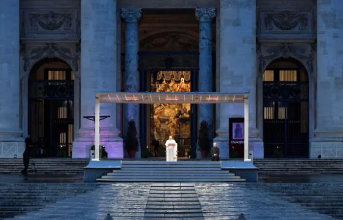 "Fitte tenebre si sono addensate sulle nostre piazze, strade e città; si sono impadronite delle nostre vite riempiendo tutto di un silenzio assordante e di un vuoto desolante, che paralizza ogni cosa al suo passaggio: si sente nell’aria, si avverte nei gesti, lo dicono gli sguardi", queste le parole del Papa venerdì 27 marzo 2020 alle ore 18 circa.