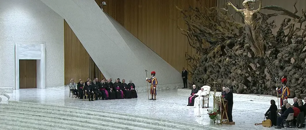 Papa Francesco in Aula Paolo VI incontra le Comunità del Cammino Neocatecumenale. Il Papa non ha un testo preparato per l'occasione, ma parla a braccio ai presenti.