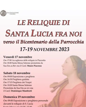Dal 17 al 19 novembre, i fedeli di Roma potranno pregare sulle reliquie della “patrona della vista” presso il santuario di San Salvatore in Lauro, che si trova nel rione Ponte, a Roma. E' la prima volta nella storia.