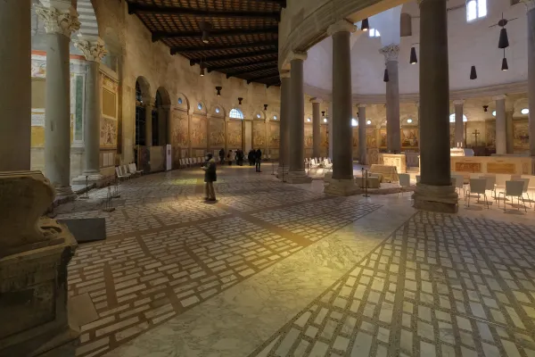 L’interno della chiesa è settecentesco, ma quello che descrive Ugonio è ancora la chiesa medievale. Vede ancora l’antica “schola cantorum”: “un spatio di marmo, chiuso, con sedili del medesimo attorno, che appoggiano alle colonne della chiesa.”