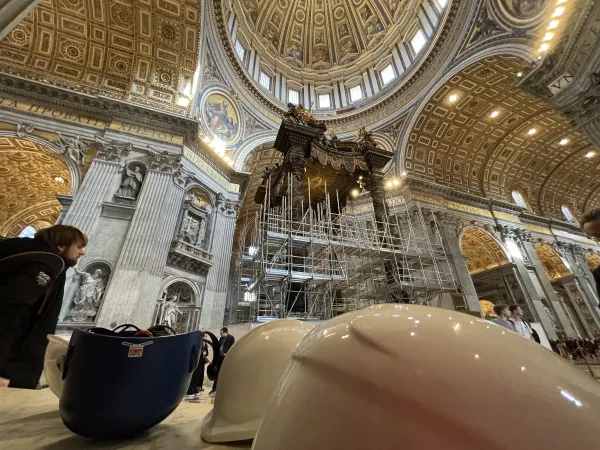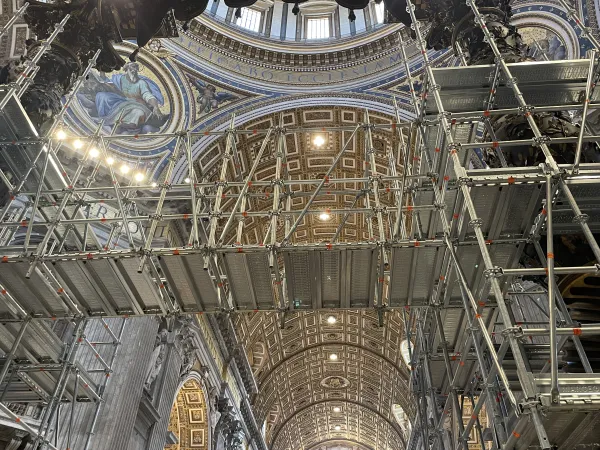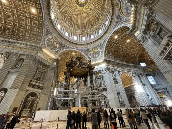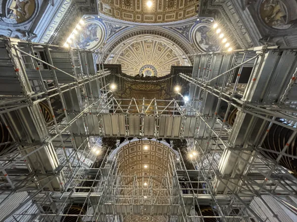 Per qualche giorno il reticolo di tubi color argento lo vedranno turisti e fedeli che entrano a San Pietro. Una immensa filigrana che ricopre e nasconde il capolavoro di bronzo del Baldacchino del Bernini, alla cui realizzazione contribuì anche Borromini, che sovrasta l'altare sulla tomba di San Pietro. Un baldacchino erede degli antichi cibori che segnavano le tombe di apostoli e martiri, un baldacchino che esalta con i suoi 29 metri di altezza, la gloria di papa Urbano VIII Barberini con le api che decorano le quattro colonne tortili.