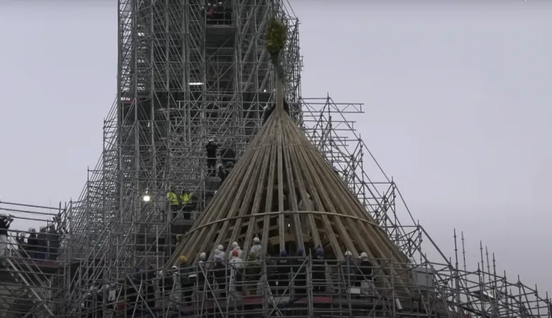 L’installazione del quadro del coro ha impiegato 18 mesi di lavoro. E allora Philippe Jost, presidente dell'istituto pubblico Rebâtir Notre-Dame de Paris, Philippe Villeneuve, capo architetto dei monumenti storici, e mons. Olivier Ribadeau Dumas, rettore arciprete di Notre-Dame, sono saliti con i compagni al livello della cornice dell'abside, per piantarvi gli ultimi due tasselli; un gesto simbolico subito seguito dalla tradizionale deposizione del bouquet, da parte del falegname più giovane della squadra, Léonard, apprendista di 19 anni.