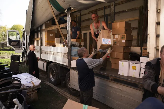 È in questa situazione che la Chiesa Greco Cattolica Ucraina distribuisce aiuti. Il centro è la cattedrale di Saltivska. Lì, nella più grande area residenziale ucraina, vengono raccolti li aiuti (alcuni arrivano dalla cattedrale di Santa Sofia a Roma), mentre il vescovo Vasyl Tuchapets osserva il processo, mettendosi in prima linea.