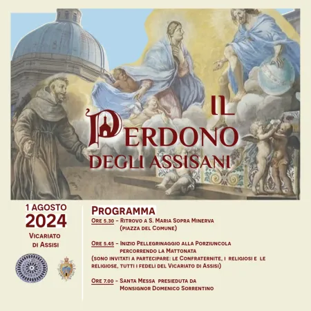 La Diocesi di Assisi come ogni anno organizza il "perdono degli assisani". Il ritrovo è fissato per giovedì 1 agosto alle ore 5,30 davanti alla chiesa di Santa Maria sopra Minerva in piazza del Comune ad Assisi; da lì si raggiungerà l’antica via mattonata. Alle ore 7 il vescovo monsignor Domenico Sorrentino presiederà la santa messa nella Basilica di Santa Maria degli Angeli.