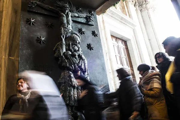L'autore è Luigi Enzo Mattei e l’opera, dovuta al concorso indetto in occasione del Grande Giubileo del 2000 e dedicata al III Millennio, fu benedetta da Giovanni Paolo II l’8 dicembre 2001, citata in seguito nel discorso ai Vescovi italiani da Benedetto XVI e aperta, per la prima volta, da Papa Francesco il 1° gennaio 2016, in apertura a Roma del Giubileo della Misericordia.