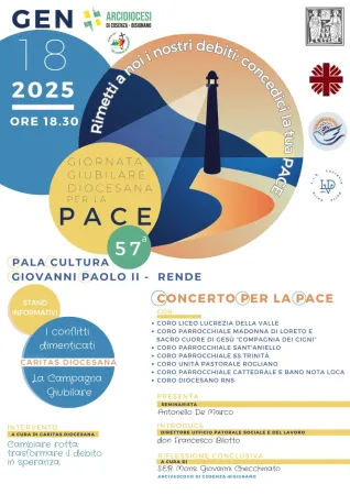 La diocesi di Cosenza ha organizzato un "concerto per la pace" il prossimo 18 gennaio, alle ore 18.30, presso il Palacultura “Giovani Paolo II” di Rende, in occasione della Giornata giubilare diocesana per la Pace.
