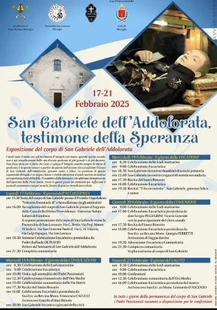 Dal 17 al 21 febbraio 2025 l’urna contenente le spoglie mortali di San Gabriele dell’Addolorata compirà un pellegrinaggio a Bisceglie, in Puglia. L’urna arriverà a nella città pugliese lunedì 17 febbraio, alle ore 15.30. A dare la notizia è il comunicato del Santuario di San Gabriele.