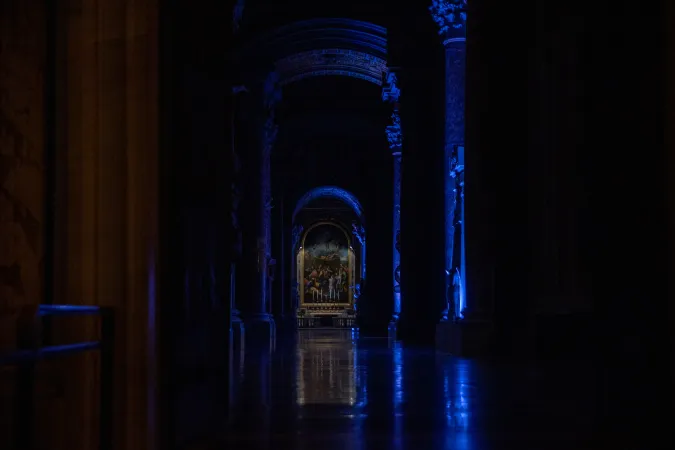 L'entrata, suggestiva, è stata nel buio. L'unico fascio di luce è stato sulla bellissima Pietà di Michelangelo. Altri suggestivi spiragli di luce hanno illuminato le statue laterali che conducono accanto al Baldacchino. Spazio alla preghiera e alla riflessione.