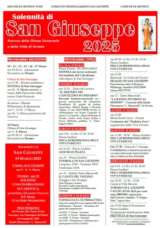Mercoledì 19 marzo, fanno sapere sempre dalla Diocesi, il programma delle celebrazioni religiose prevede la Santa Messa alle ore 9:00 e alle ore 11:00 presso la chiesa di San Giuseppe. Nel pomeriggio, alle 18:00, in Duomo, la solenne Concelebrazione Eucaristica presieduta dal Vescovo Gualtiero Sigismondi, a cui farà seguito la processione con l’immagine di San Giuseppe fino alla chiesa del Santo, accompagnata dalla Filarmonica “L. Mancinelli” di Orvieto.