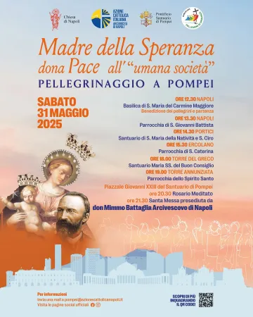 L’appuntamento è fissato per sabato 31 maggio 2025; il pellegrinaggio avrà inizio alle ore 12.30 presso la Basilica di Maria SS. del Carmine Maggiore a Napoli, con la Benedizione dei pellegrini, e si concluderà con la Celebrazione Eucaristica alle ore 21.30 presso il Piazzale San Giovanni XXIII del Santuario di Pompei, che sarà presieduta dall’Arcivescovo metropolita di Napoli Monsignor Domenico Battaglia.