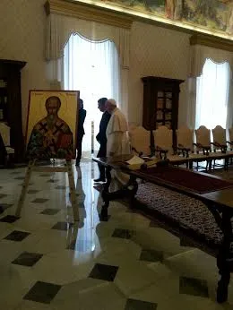 Il Papa si è trattenuto in incontro privato prima con il Presidente di Bulgaria e il colloquio è durato 30 minuti con un interprete. Il Presidente bulgaro era accompagnato dalla Delegazione e dal patriarca ortodosso. Per il consueto scambio dei doni il Papa ha regalato alla Bulgaria i suoi tre libri ,le esortazioni apostoliche "Evangelii Gaudium" e "Amoris Laetitia" e l' enciclica "Laudato si’", insieme al medaglione con l'ulivo della pace. Il Presidente bulgaro ha invece donato al Pontefice un'icona che rappresenta San Clemente di Ohrid. San Clemente fu il primo vescovo della Chiesa ortodossa bulgara, discepolo dei santi Cirillo e Metodio, scrisse il Vangelo in lingua slava.