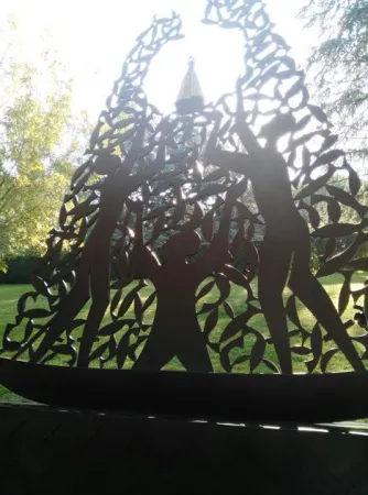 La statua racconta il momento della scoperta, tre secoli fa, dell'immagine della Madonna: i tre pescatori, la barca, la rete e nostra Signora di Aparecida.