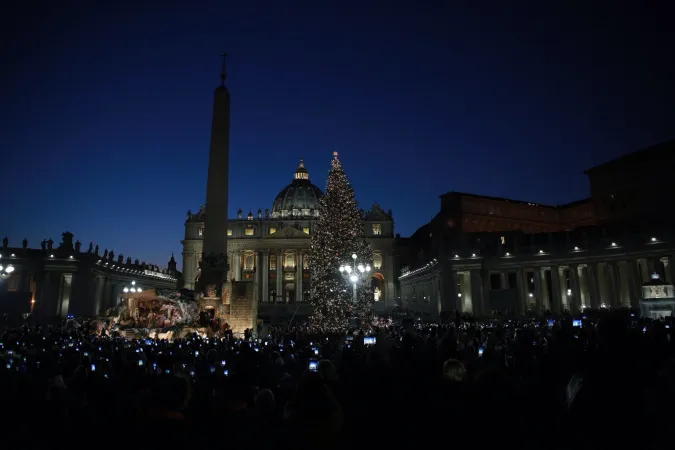 Alle 16.30 una cerimonia di inaugurazione ha illuminato l’albero e inaugurato il presepe di Natale in Piazza San Pietro. Un’intensa atmosfera natalizia ha caratterizzato l’evento: musiche dalla Banda Musicale del Corpo della Gendarmeria in formazione da parata con la “Marcia all’antica”, Marcia d’Ordinanza della Gendarmeria; l’intermezzo Musicale “In Notte Placida”, accensione dell’Albero di Natale mentre viene eseguito il canto ‘Lauda dell’Epifania’, “Tu scendi dalle stelle” e tante altre.