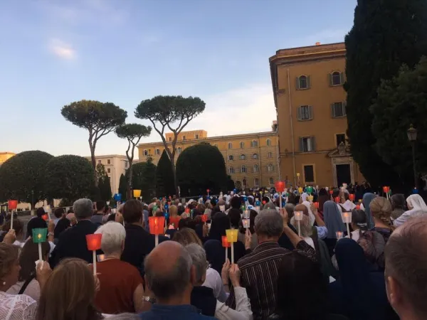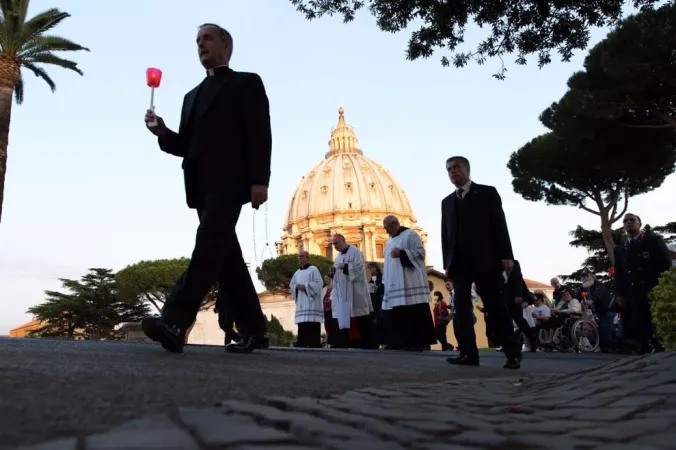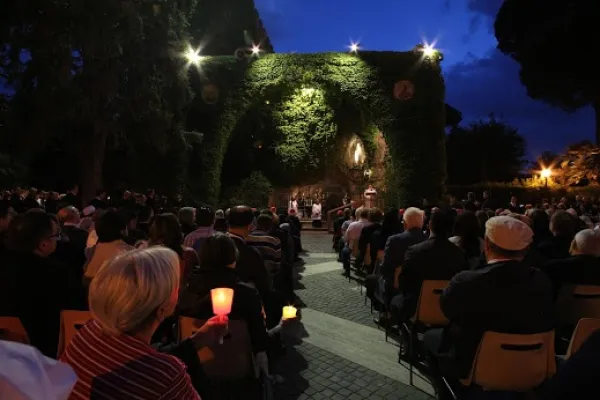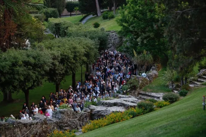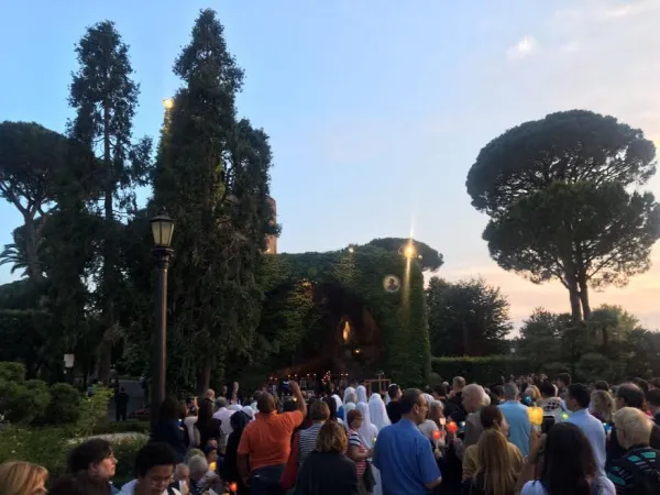 Fiaccole, preghiere, riflessioni e canti accompagnano la devota processione. Un popolo che cammina, prega il rosario e canta. Un popolo fatto di anziani, persone in carrozzella, bambini in passeggino, uomini e donne, che si rivolge a Maria. Questa è l’inedita immagine, densa di commozione, a cui tradizionalmente alla fine del mese di maggio, si assiste nei giardini vaticani. La cupola di San Pietro fa da sfondo.