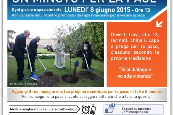 “Nel nostro tempo c’è tanto bisogno di pregare – cristiani, ebrei e musulmani – per la pace”. E’ l’appello di Papa Francesco durante l’Udienza Generale di oggi in occasione dell’iniziativa “Un minuto per la pace”, cioè – come spiega lo stesso Pontefice – “un piccolo momento di preghiera nella ricorrenza dell’incontro in Vaticano tra me, il compianto Presidente israeliano Peres e il Presidente palestinese Abbas”.