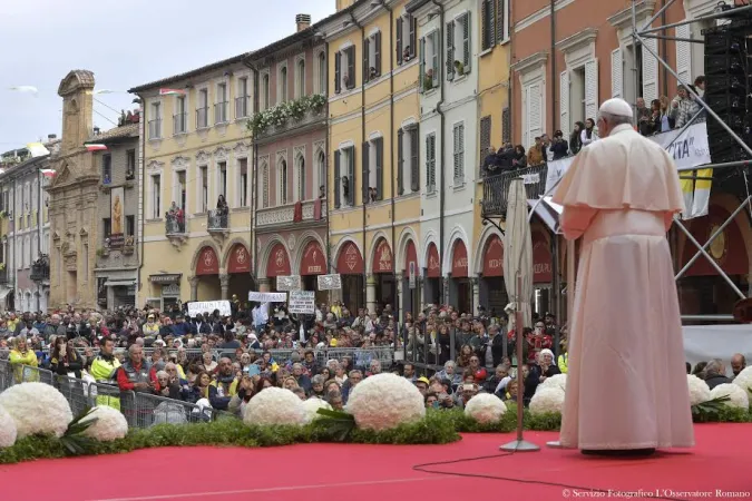Quella a Cesena è la prima, veloce, tappa della visita pastorale di Papa Francesco in Emilia-Romagna, 31 anni dopo quella di San Giovanni Paolo II. La città romagnola celebra i 300 anni dalla nascita di Pio VI, al secolo Giannangelo Braschi. Francesco arriva in elicottero nella cittadina romagnola e fa subito il suo saluto alla cittadinanza, in Piazza del Popolo.