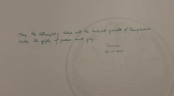 Terzo pontefice a visitare il Bangladesh, Papa Francesco prima di arrivare a parlare con le autorità passa dal National Martyr’s Memorial, e poi rende omaggio al padre della Nazione, Sheih Mujibur Rahman, andando nel memoriale a lui dedicato, il “Banghabandu Memorial Museum”, che altro non è che la casa del leader che fu trucidato insieme a gran parte della sua famiglia, e poi incontra privatamente il presidente del Bangladesh.