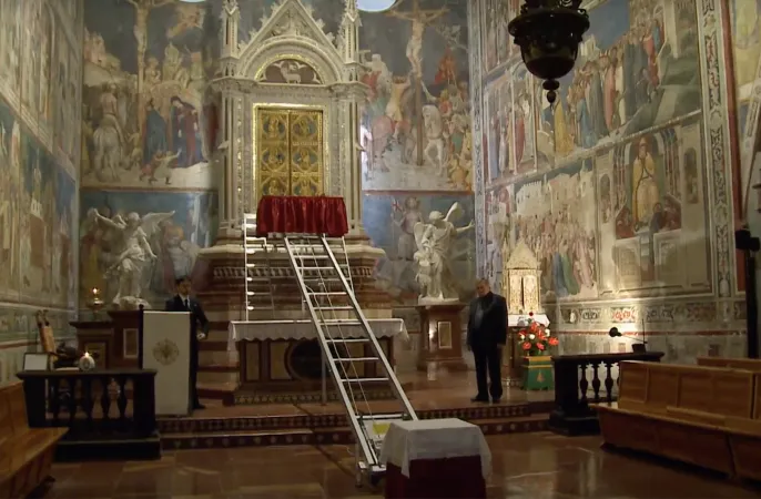 La decorazione della Cappella, in concomitanza al dibattito teologico del XIV secolo fra Domenicani e Francescani sul sangue di Cristo, si presenta come un compendio sull’eucarestia, una enciclopedia del XIV secolo, definita da un vocazione alla chiarezza dell’enunciato, didattica, e come un’esaltazione di s. Tommaso d’Aquino che, a trent’anni dalla canonizzazione, negli affreschi della volta della cappella è presentato, insieme a s. Agostino, s. Paolo e s. Giovanni, come un’autorità indiscussa sul tema eucaristico.