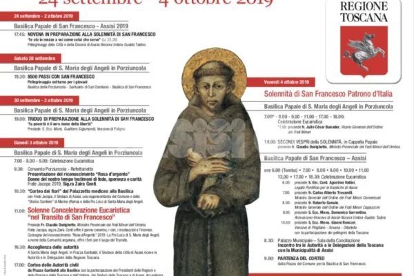I frati minori – con un comunicato stampa ufficiale – segnalano tutti gli eventi importanti. In particolare per il giorno del Transito, mercoledì 3 ottobre: alle 9.30, presentazione del riconoscimento “Rosa d’argento” alla sig.ra Azzurra Di Spirito e consegna della Rosa durante la solenne celebrazione eucaristica “nel Transito di San Francesco”, presieduta alle 11.00 da P. Claudio Durighetto, Ministro provinciale dei Frati Minori dell’Umbria, nella Basilica Papale di Santa Maria degli Angeli.