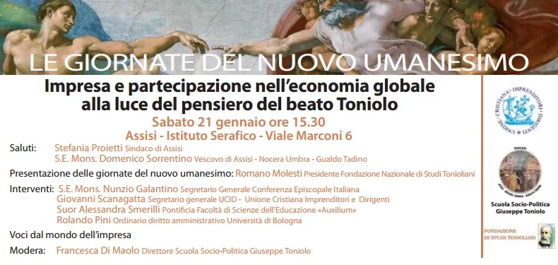 “Questi incontri - commenta Francesca Di Maolo, presidente della Commissione problemi sociali e lavoro - sono stati denominati Le giornate del nuovo umanesimo ad indicare che, dopo i fallimenti delle varie ideologie che si sono registrate nel secolo breve, dopo i tentativi, tutti falliti, di creare un nuovo ordine interno e internazionale basato sui principi di un laicismo materialista, è più che mai urgente riscoprire, pur in dialogo con altre ispirazioni e culture, i principi fondamentali del cristianesimo e della dottrina sociale della Chiesa, sicura fonte di ispirazione capace di avviare a soluzione i problemi attuali sempre più gravi e complessi. Le Giornate del nuovo umanesimo dovranno affrontare tematiche attuali e di grande interesse con la maggiore concretezza possibile, evitando le trattazioni fine a se stesse, i linguaggi accademici e paludati, ma soprattutto, dovranno farsi portavoce di proposte concrete. E’ il momento che i cattolici si sentano impegnati in un’opera di riscoperta dei valori fondanti della nostra civiltà ed elaborino soluzioni, in una parola, che facciano sentire la propria voce. Attualità e concretezza vorrebbero essere, dunque, le caratteristiche di queste giornate del nuovo umanesimo, che intendono recuperare lo spirito con cui Giuseppe Toniolo, a cavallo dell’otto-novecento, aveva cercato di affrontare i problemi allora più urgenti”.