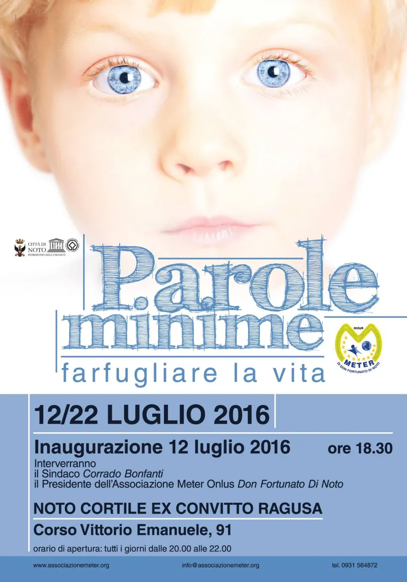 Pannelli con frasi “farfugliate” e immagini di bambini che vogliono sensibilizzare e far riflettere sul tema dell’abuso dei minori. E’ il tema della mostra “Parole minime” a Noto (nel cortile dell’ex Convitto Ragusa, Corso Vittorio Emanuele 91) per iniziativa dell’associazione Meter Onlus di don Fortunato Di Noto (dal 12 al 22 luglio, ore 20-22), che si occupa della lotta contro la pedofilia e la tutela dell’infanzia.