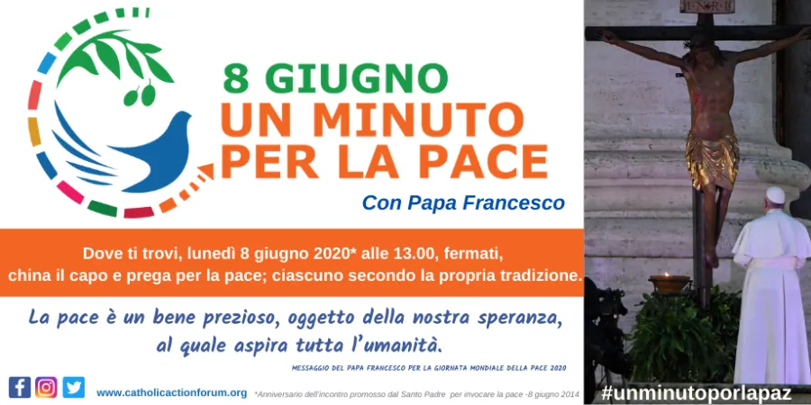 Infine si chiede di condividere l’impegno per la pace con un piccolo gesto concreto: inviare una propria foto con in mano un foglio bianco e la scritta #UNMINUTOPORLAPAZ con la traduzione nella lingua nazionale o locale all’indirizzo catholicactionforum@gmail.com