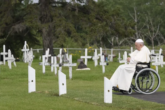 "Sono qui perché il primo passo di questo pellegrinaggio penitenziale in mezzo a voi è quello di rinnovarvi la richiesta di perdono e di dirvi, di tutto cuore, che sono profondamente addolorato: chiedo perdono per i modi in cui, purtroppo, molti cristiani hanno sostenuto la mentalità colonizzatrice delle potenze che hanno oppresso i popoli indigeni. Sono addolorato. Chiedo perdono, in particolare, per i modi in cui molti membri della Chiesa e delle comunità religiose hanno cooperato, anche attraverso l’indifferenza, a quei progetti di distruzione culturale e assimilazione forzata dei governi dell’epoca, culminati nel sistema delle scuole residenziali. Vorrei ribadirlo con vergogna e chiarezza: chiedo umilmente perdono per il male commesso da tanti cristiani contro le popolazioni indigene.", Francesco chiede umilmente perdono.