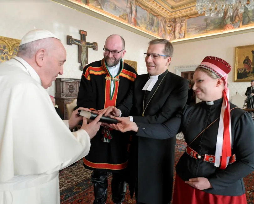 “E’ con particolare gioia che accolgo e saluto i rappresentanti Sami” ha detto il Papa nel suoi saluto. Quest’anno infatti per la prima volta c’è anche una rappresentante del popolo Sami, gli indigeni della Finlandia, è la pastora Sámi, Mari Valjakka, e il vicario di Inari, Tuomo Huusko che hanno donato al Papa una edizione della nuova traduzione della Bibbia nella lingua dei Sámi del Nord.