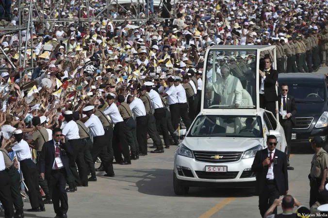 Papa Francesco in Perù | Papa Francesco arriva nella Base Aerea Las Palmas, per la celebrazione della Messa, Lima, 21 gennaio 2018 | Vatican Media / ACI Group