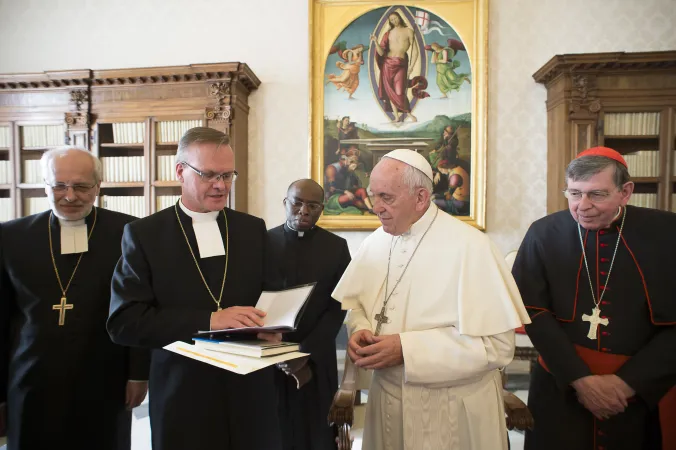 Dopo aver ricordato i passi avanti compiuti nel dialogo tra cattolici e luterani, Papa Francesco sottolinea come il servizio ecumenico consista "precisamente in un’epoca in cui le società sono ampiamente secolarizzate, nel testimoniare la presenza del Dio vivente, perché la principale sfida comune nell’ecumenismo è ribadire la centralità della questione di Dio, non di un Dio qualsiasi, ma di quel Dio che ci ha rivelato il suo volto concreto nell’uomo Gesù di Nazareth. Poiché oggi luterani e cattolici sono in grado di confessare insieme la centralità della questione di Dio, è stato possibile realizzare una commemorazione ecumenica della Riforma, e questo non in senso meramente pragmatico, ma nel senso profondo della fede nel Cristo crocifisso e risorto, che possiamo adesso testimoniare insieme. Facendo ciò, abbiamo assunto la grande responsabilità ecumenica che ci è stata efficacemente ricordata dalla commemorazione della Riforma del 2017".