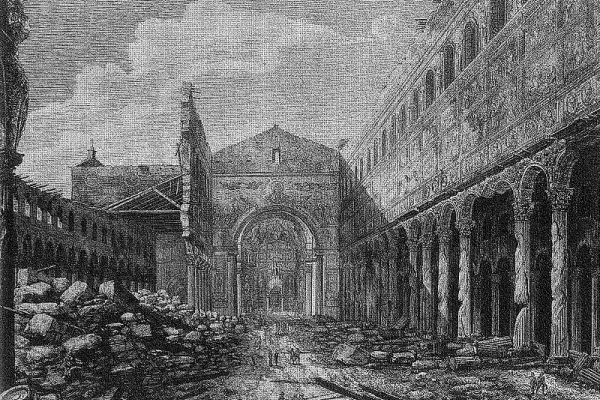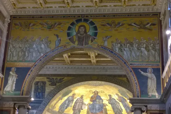 Il nucleo di tutto il santuario è oggi la basilica costruita da Papa Pelagio alla fine del VI secolo. Questa piccola basilica con gallerie viene trasformato nel presbiterio della chiesa medievale demolendo la sua antica abside e girando l’asse della prima chiesa di 180 gradi. Per questo l’arco absidale della chiesa di Pelagio conserva i suoi bei mosaici antichi sul lato rivolto verso l’attuale presbiterio e le gallerie. L’ultimo grande devoto di S. Lorenzo, il più romano di tutti i santi, fu Pio IX, che si è fatto seppellire nell’antica basilica di Pelagio.